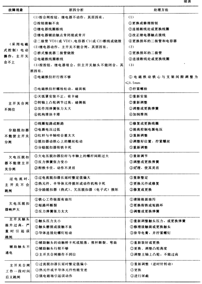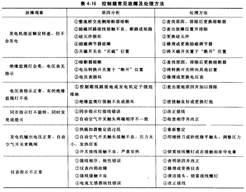 控制箱常見故障現(xiàn)象、原因分析及處理方法見表4-16