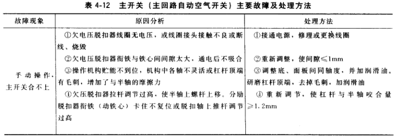 (4)主開關(guān)檢測。發(fā)電機控制屏主開關(guān)是指一次回路的自動空氣開關(guān),它起著一次回路的通、斷作用,對發(fā)電機向外安全供電很重要。除定期檢修外,如發(fā)現(xiàn)異常現(xiàn)象(如發(fā)熱、 火花、燒焦等)要及時檢査、處理。主開關(guān)主要故障現(xiàn)象、原因分析及處理方法見表4-12。