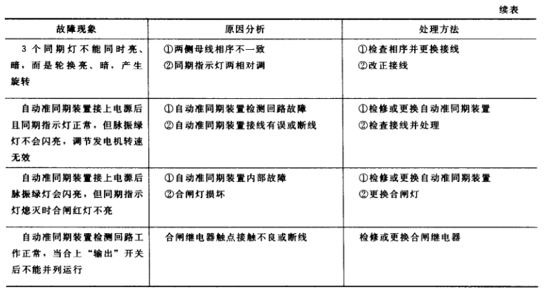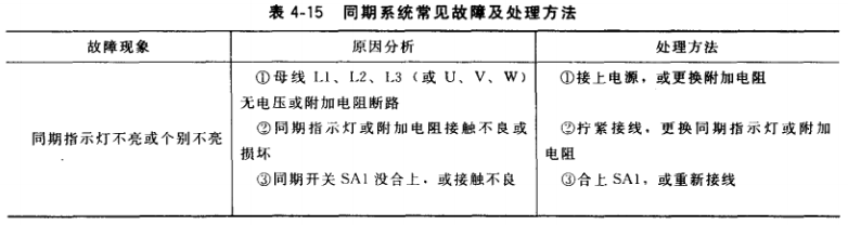 同期系統(tǒng)常見故障現(xiàn)象,原因分析及處理方法見表4-15。