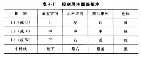 (1)相序檢測。從控制屏的正面看,控制屏主回路母線相序排列和色標應符合表4-11 規(guī)定,接入控制屏的電壓相序應與上述規(guī)定相符。
