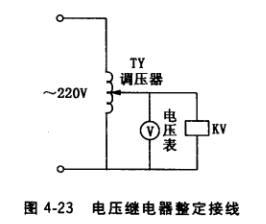 ①電壓繼電器KV整定(見圖4-23)。斷開電壓繼電 器KV線圈的外接線,接入調(diào)壓器TY的輸出端并接入電壓表。將調(diào)壓器輸出調(diào)至0,并將其輸入端接至交流 220V電源。先將KV整定旋鈕轉(zhuǎn)到最大整定值位置,然 后將調(diào)壓器輸出電莊調(diào)到KV的整定值,再將KV整定 旋鈕往整定值小的方向慢慢旋轉(zhuǎn).使KV動作,常開點 閉合。接著把調(diào)壓器回調(diào)使電壓繼電器常開觸點斷開,然后將調(diào)壓器輸出增至整定值,看KV是否動作,若不動作或動作過早就再來回整定幾次,至KV動作值與整 定值相符為止,然后將調(diào)壓器輸出電壓調(diào)至0。