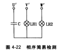相序可用相序儀檢測。在現(xiàn)場,也可用簡易方法檢測。如圖4-22所示,用2只220V、 50W燈泡和一只3μF、250V電容器接成Y形接線,U'、V'、W'分別與待測互感器U、V、 W相連接,若燈LH1比LH2更亮,則相序正確,否則相序錯接,應更正。