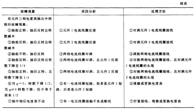 ④用抽中相法檢測三相兩元件電度表故障。在負荷不變的情況下,將電度表的中相(即 兩個電壓線圈公共接線相)電壓抽出(即拆開中相電壓線頭),然后通過抽去中相前、后轉(zhuǎn)盤轉(zhuǎn)向和轉(zhuǎn)數(shù)的變化情況來判斷接線是否有錯。