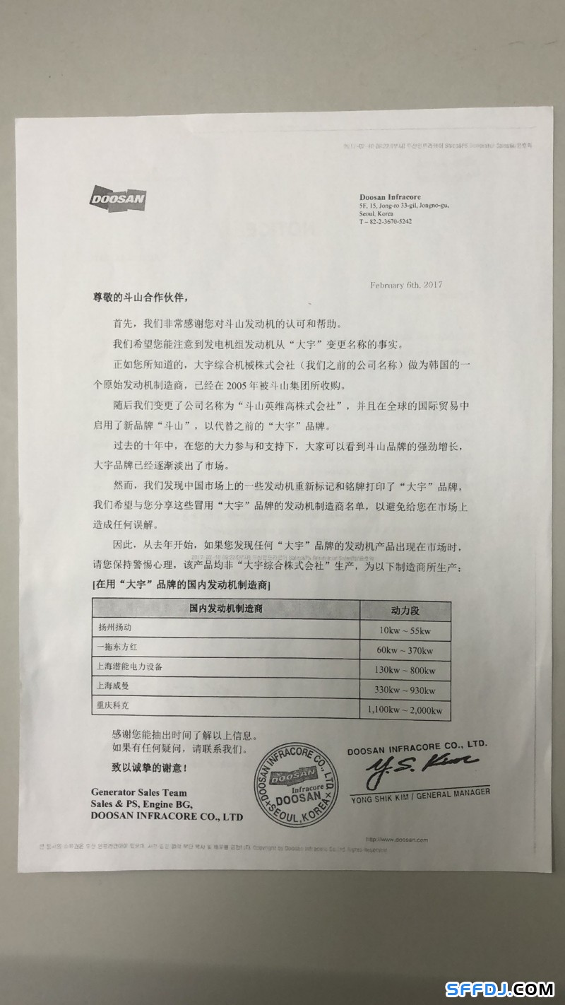 發(fā)電機(jī)組用發(fā)動(dòng)機(jī)從“大宇”變更名稱為“斗山”名稱的事實(shí)。做為韓國的一個(gè)原始發(fā)動(dòng)機(jī)制造商,已經(jīng)在2005年被斗山集團(tuán)所收購。