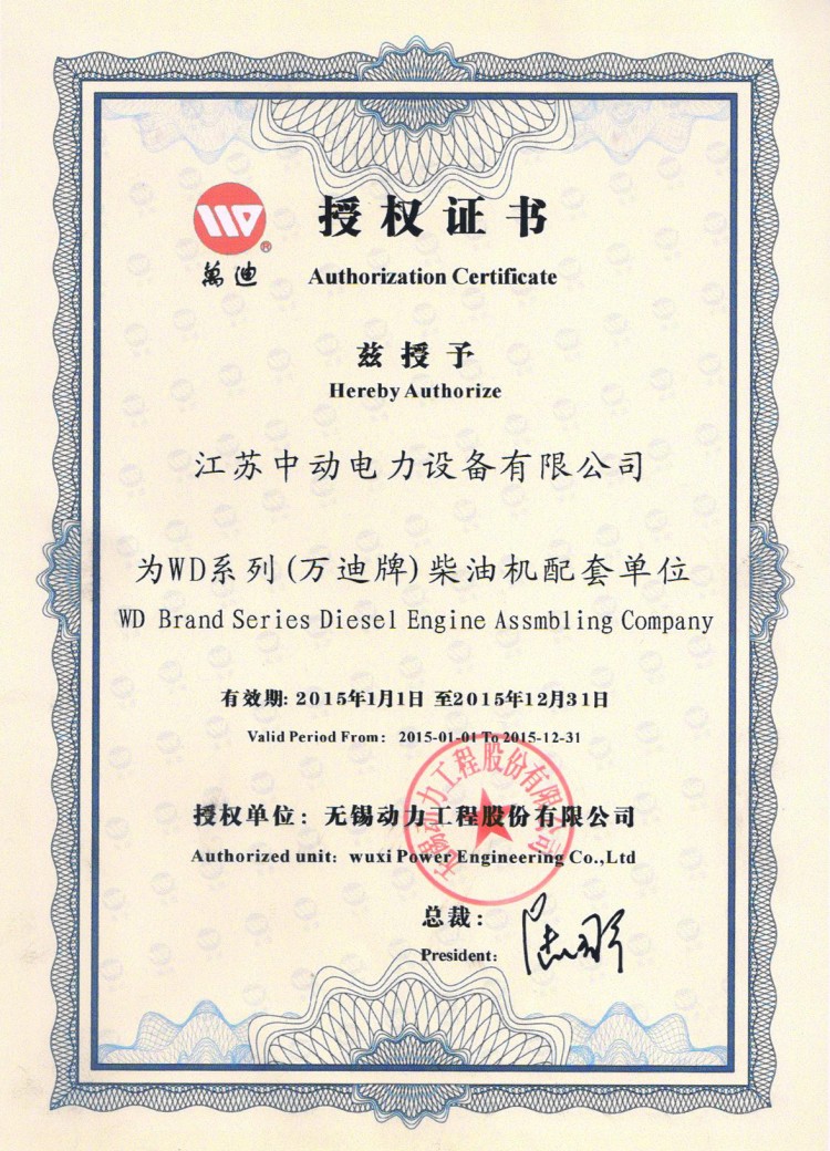 江蘇動力工程股份有限公司授權(quán)江蘇中動電力設備有限公司作為柴油機配套商